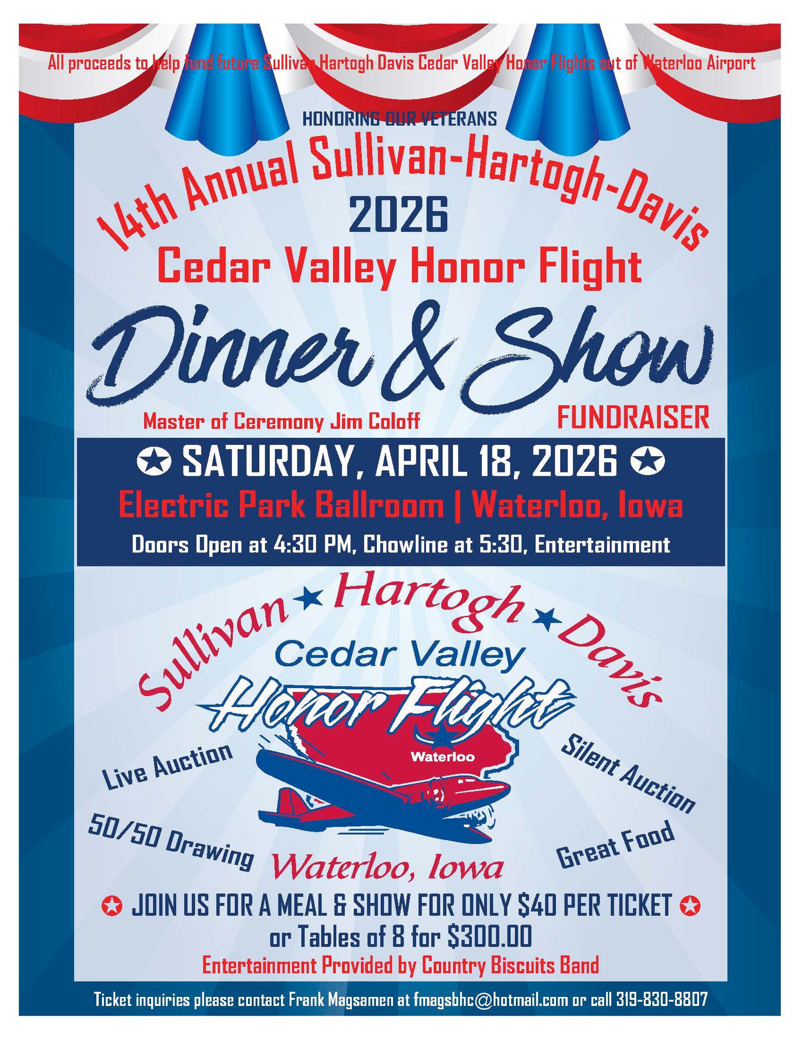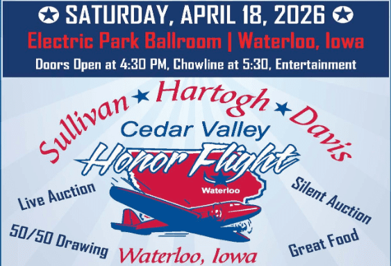 Join us at the Electric Park Ballroom for the 14th annual Sullivan-Hartogh-Davis Cedar Vallely Honor Flight on Saturday April 18, 2026!
